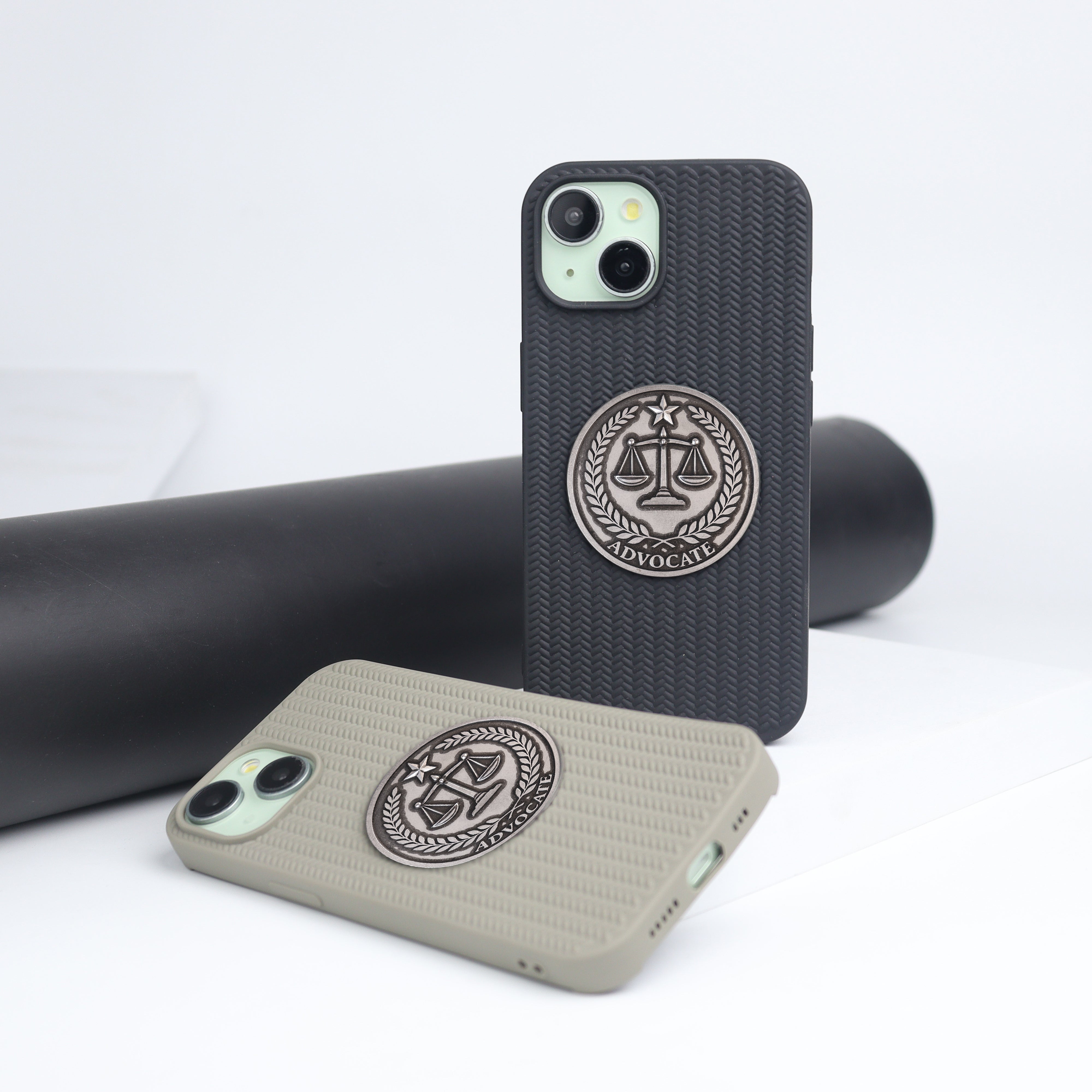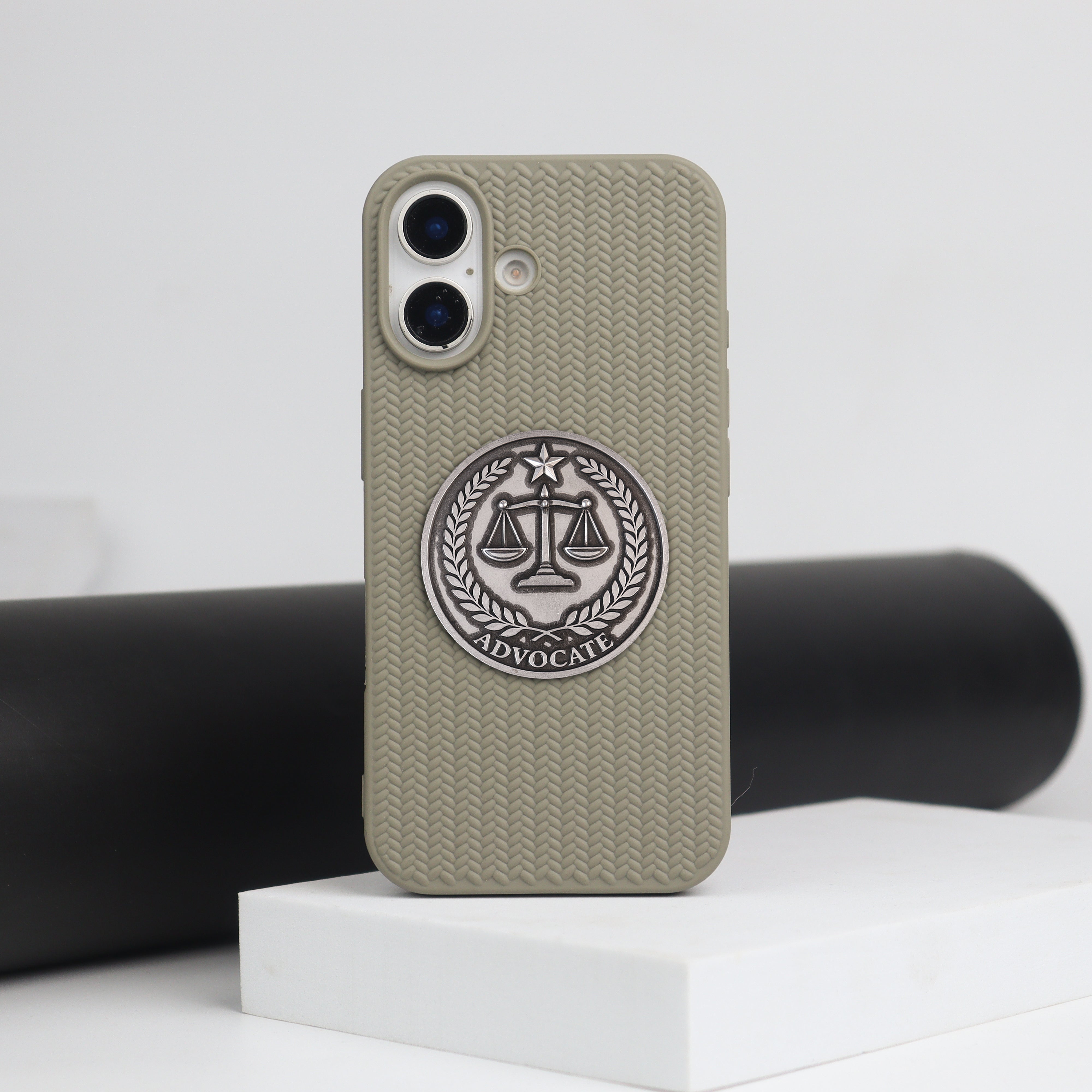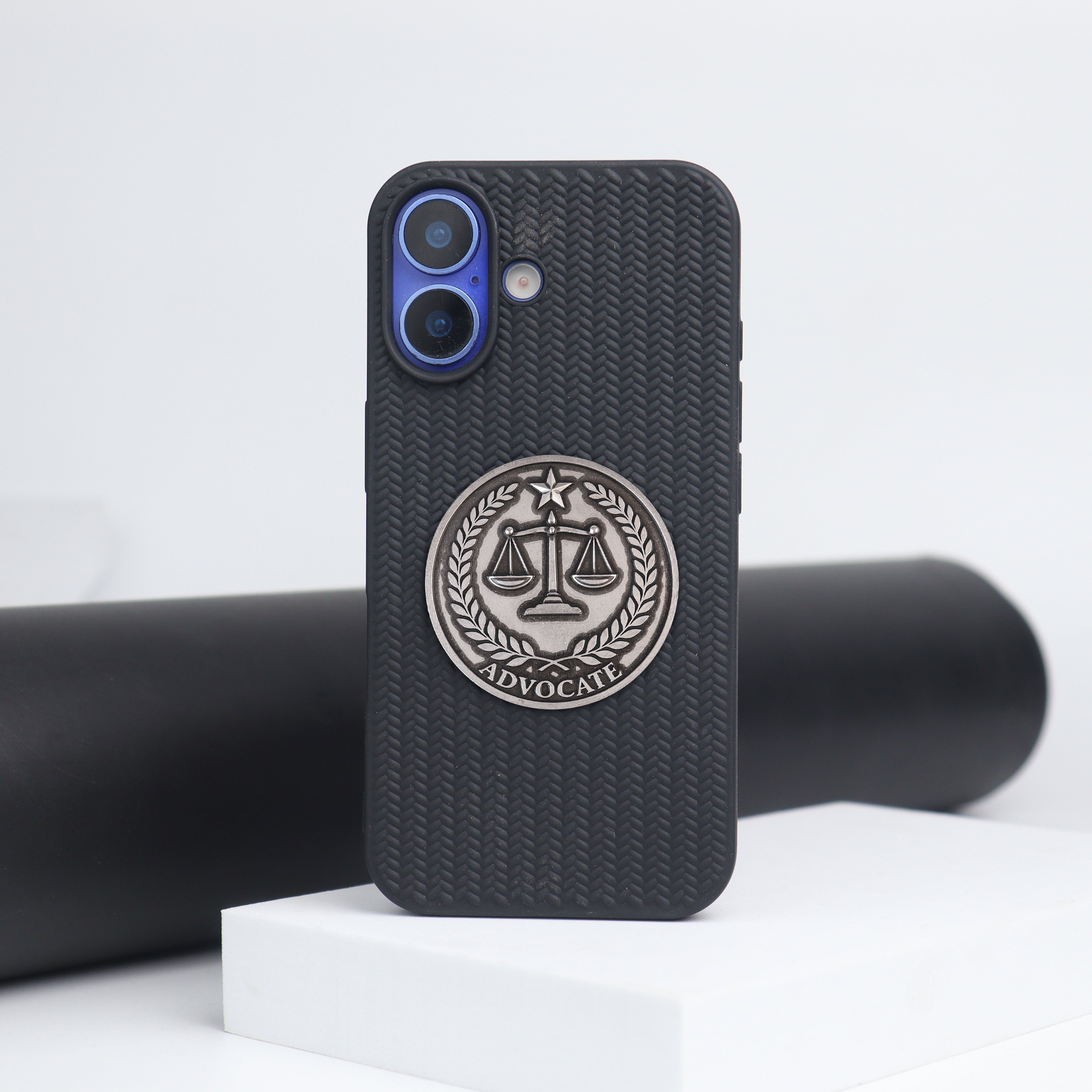 Made with high-quality, shock-absorbing material, the case offers strong protection against drops and scratches. Its textured herringbone pattern ensures a secure, non-slip grip. At the center, a raised emblem of the scales of justice, framed with laurel leaves and topped with a star, boldly highlights the word “ADVOCATE”—a symbol of justice and integrity.