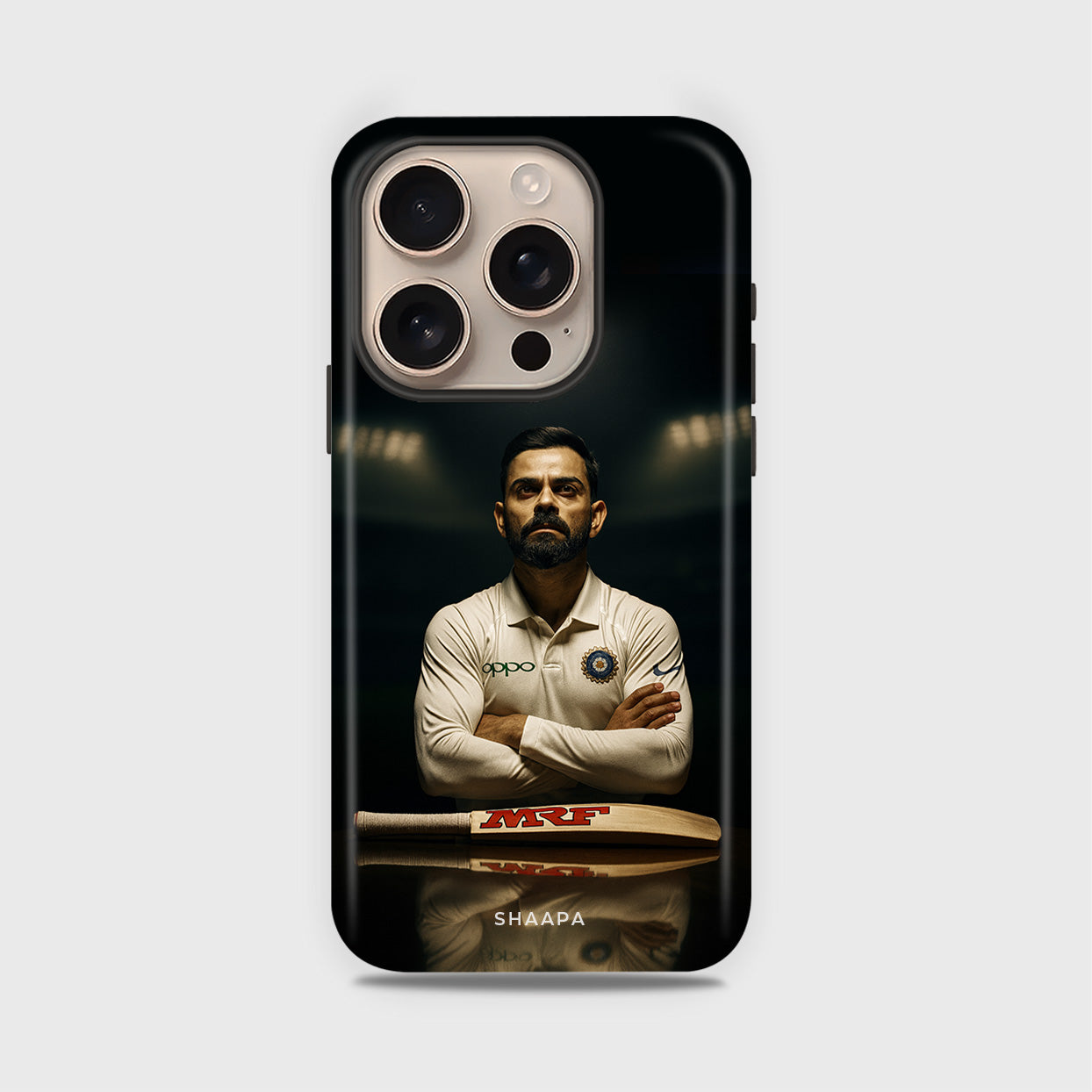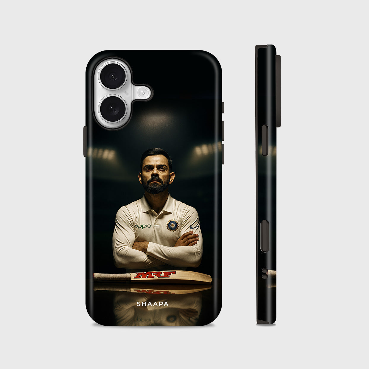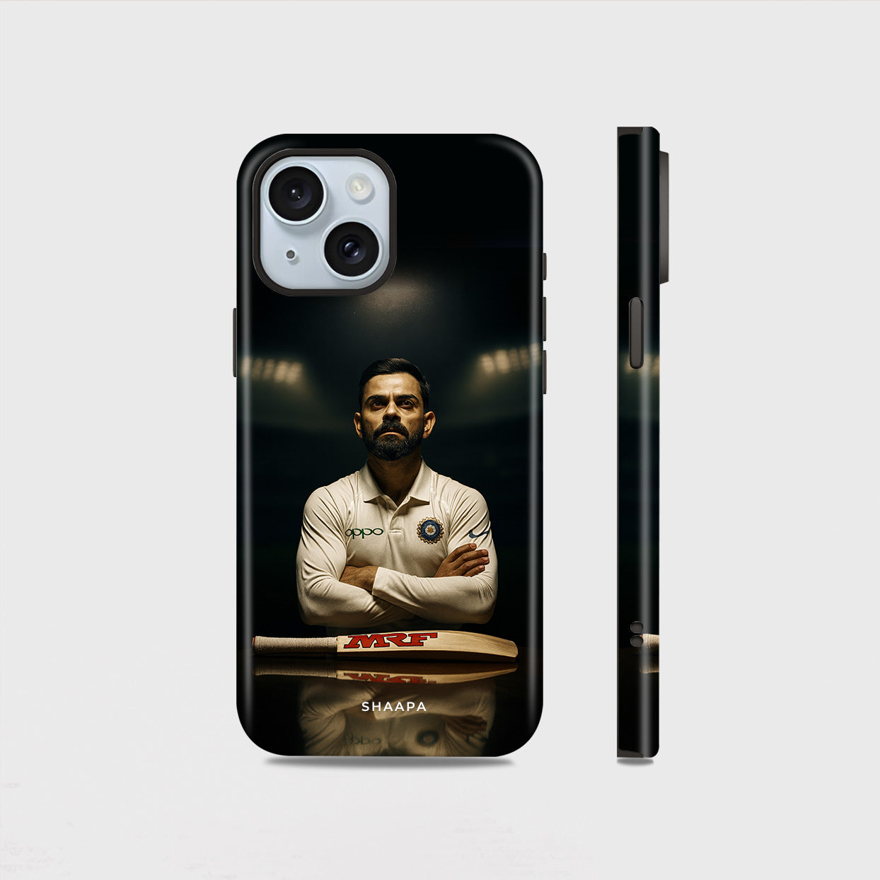 This Captain iPhone Case is the perfect tribute to the passion, determination, and legacy of the modern cricketing icon. Featuring Virat Kohli in his iconic Test jersey with folded arms and his signature intense look, the case captures the true essence of a leader and warrior on the field. The MRF bat at the bottom adds a touch of authenticity, representing his unmatched dominance in world cricket.