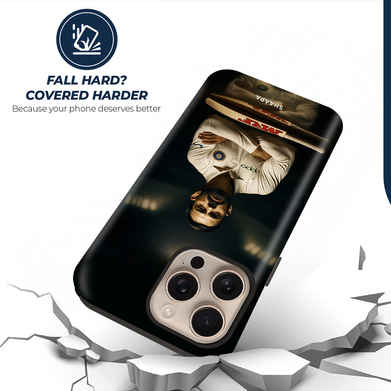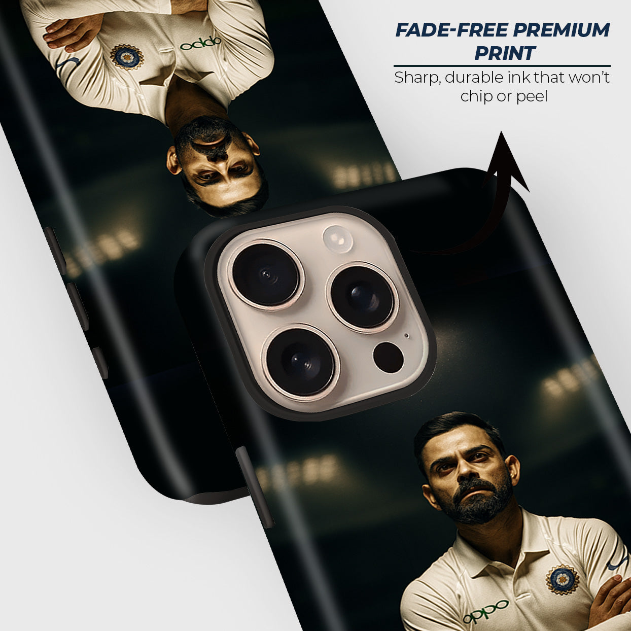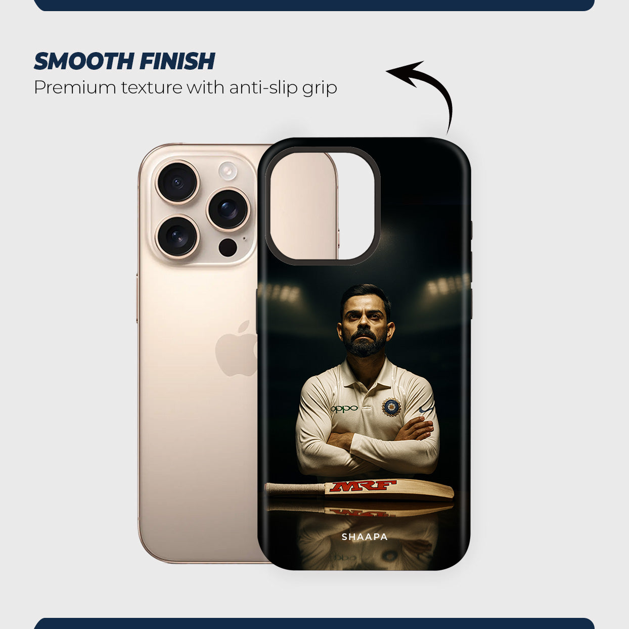 This Captain iPhone Case is the perfect tribute to the passion, determination, and legacy of the modern cricketing icon. Featuring Virat Kohli in his iconic Test jersey with folded arms and his signature intense look, the case captures the true essence of a leader and warrior on the field. The MRF bat at the bottom adds a touch of authenticity, representing his unmatched dominance in world cricket.