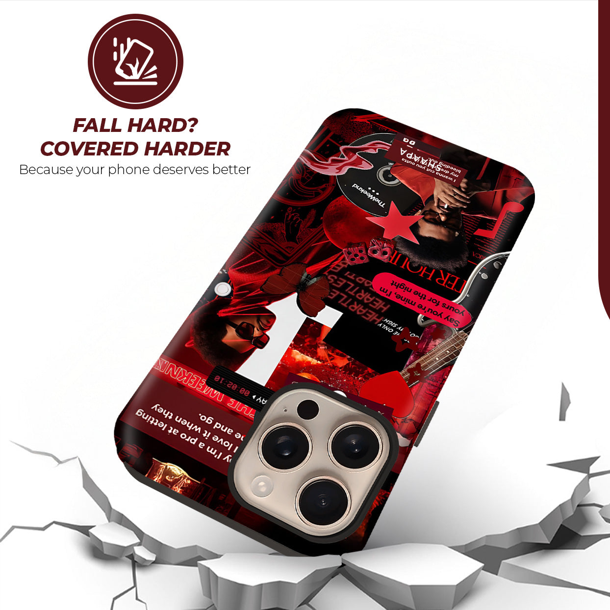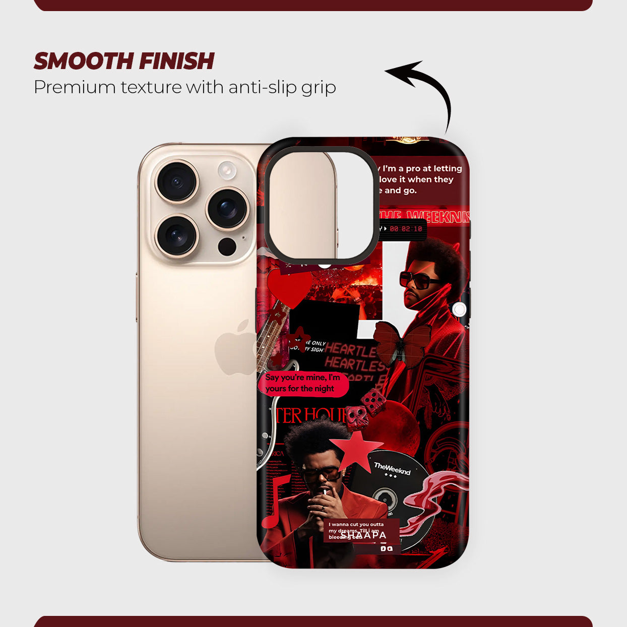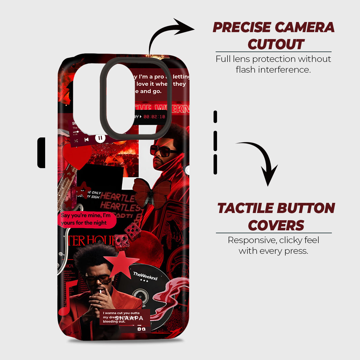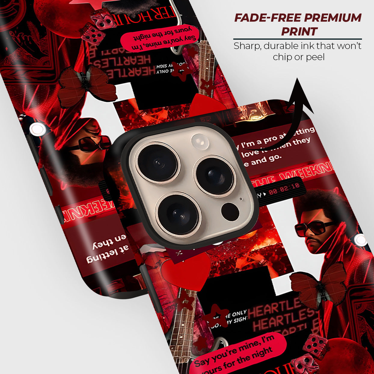 Turn up the aesthetic with the Weeknd case, inspired by The Weeknd’s iconic era. Featuring a bold red collage of his signature looks, lyrics, and visuals, this case radiates late-night energy, passion, and artistry. A must-have for true fans who live for the music and the mood.