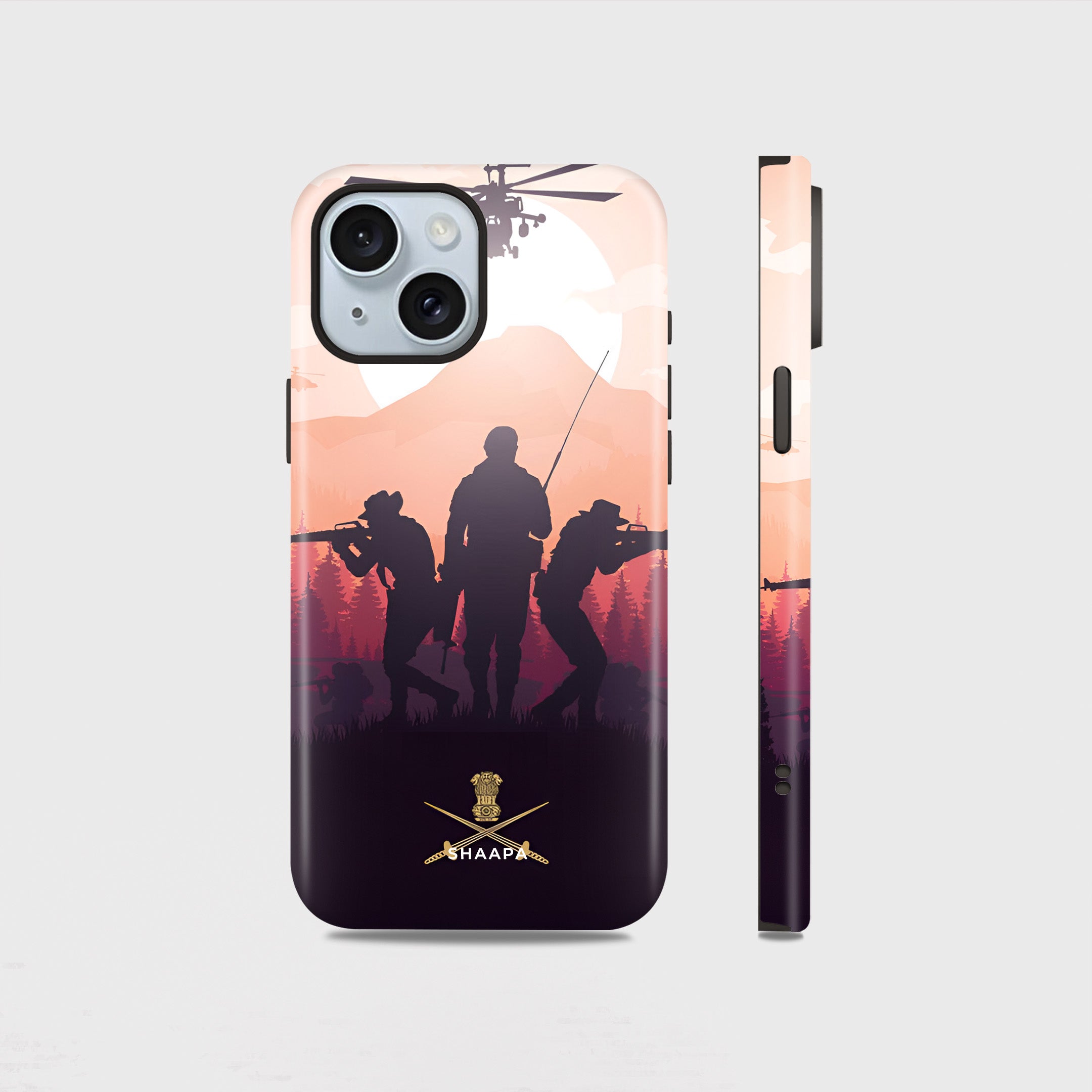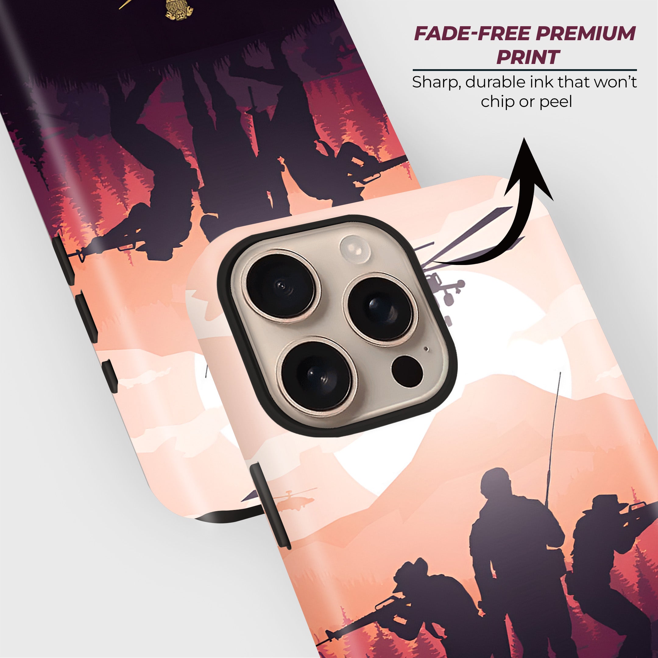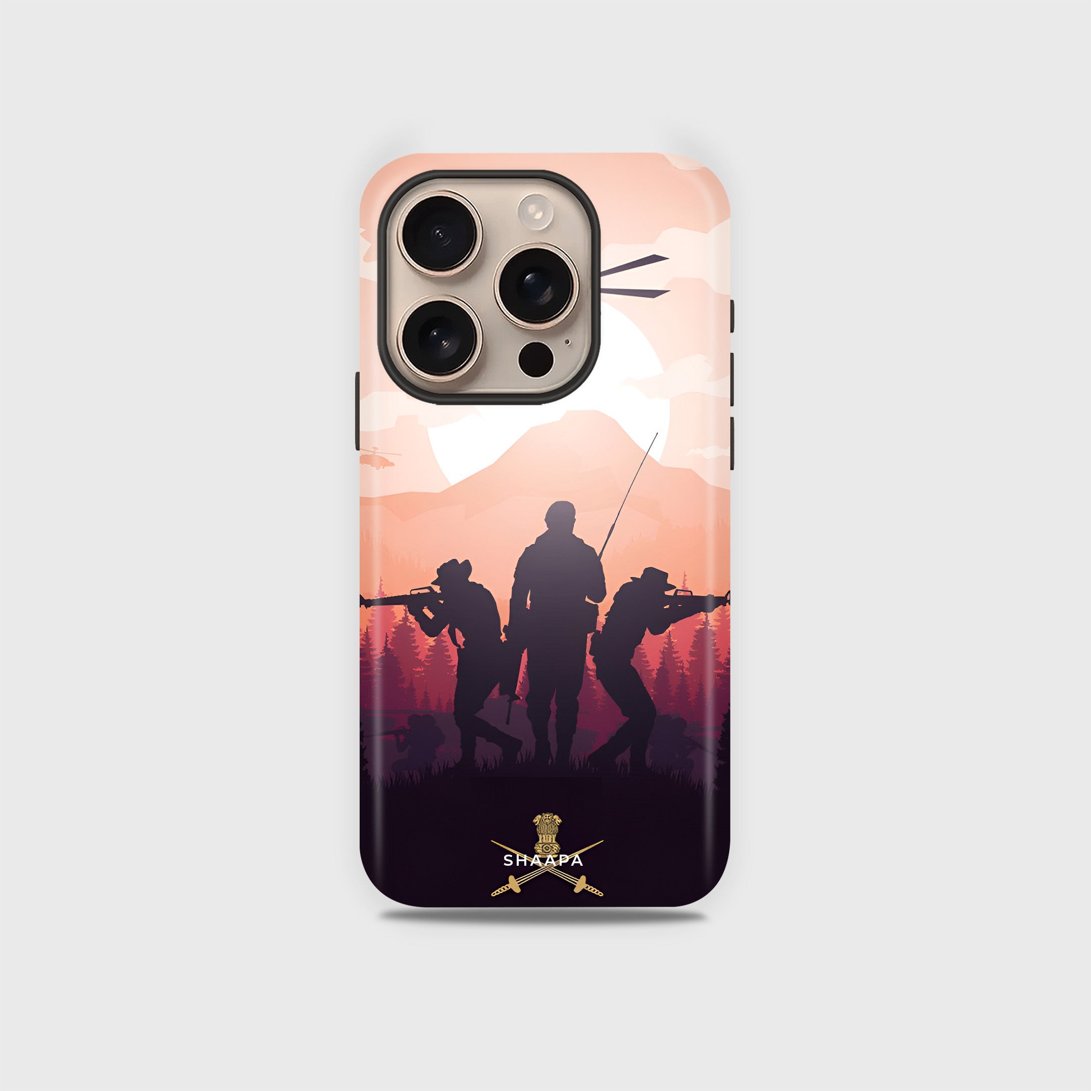 Showcase your patriotism with this Fighters. Featuring a striking silhouette of armed soldiers and helicopters set against a scenic backdrop of mountains and a sunset sky, this design captures the courage and valor of our defense forces. At the bottom, the case proudly displays the official crossed swords insignia, symbolizing strength and honor.