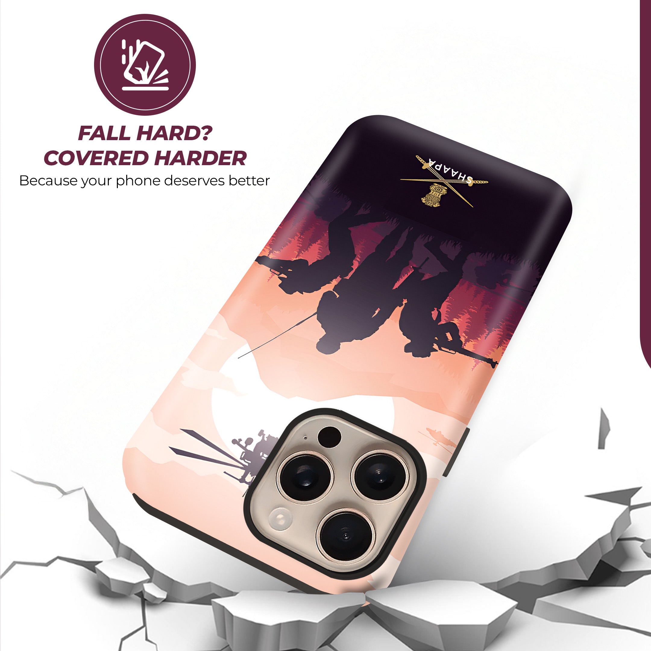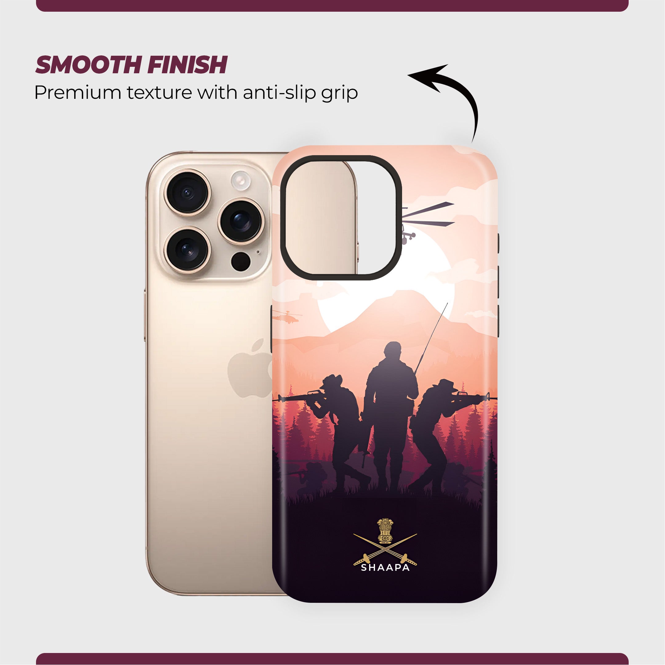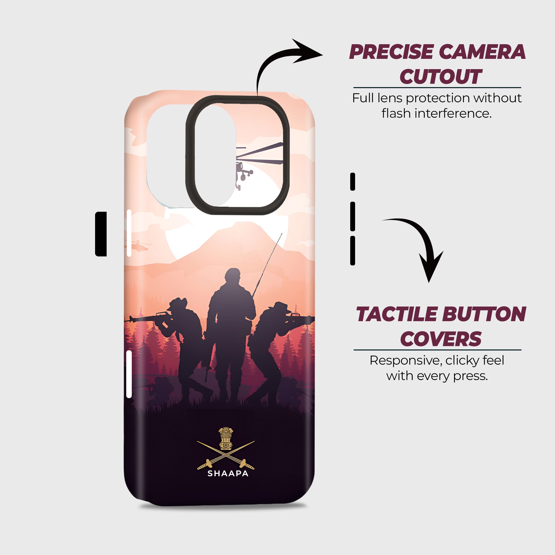 Showcase your patriotism with this Fighters. Featuring a striking silhouette of armed soldiers and helicopters set against a scenic backdrop of mountains and a sunset sky, this design captures the courage and valor of our defense forces. At the bottom, the case proudly displays the official crossed swords insignia, symbolizing strength and honor.