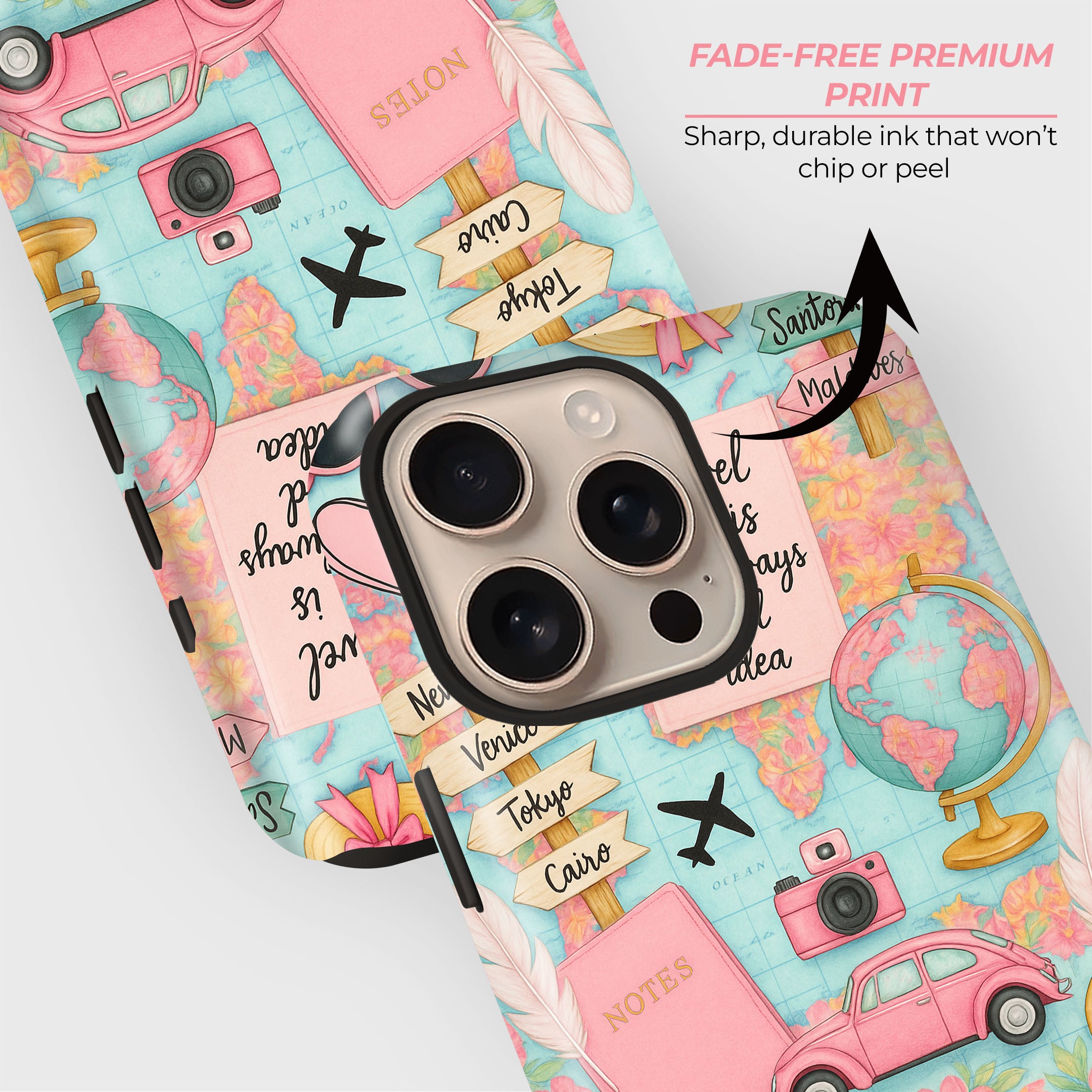 - Playfully illustrated with airplanes, passports, globes, and a vintage pink car—all set against a dreamy pastel map backdrop.