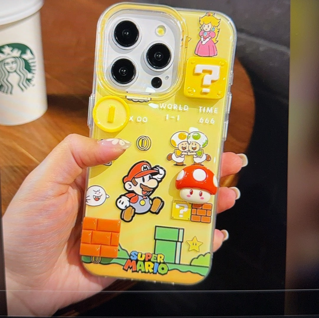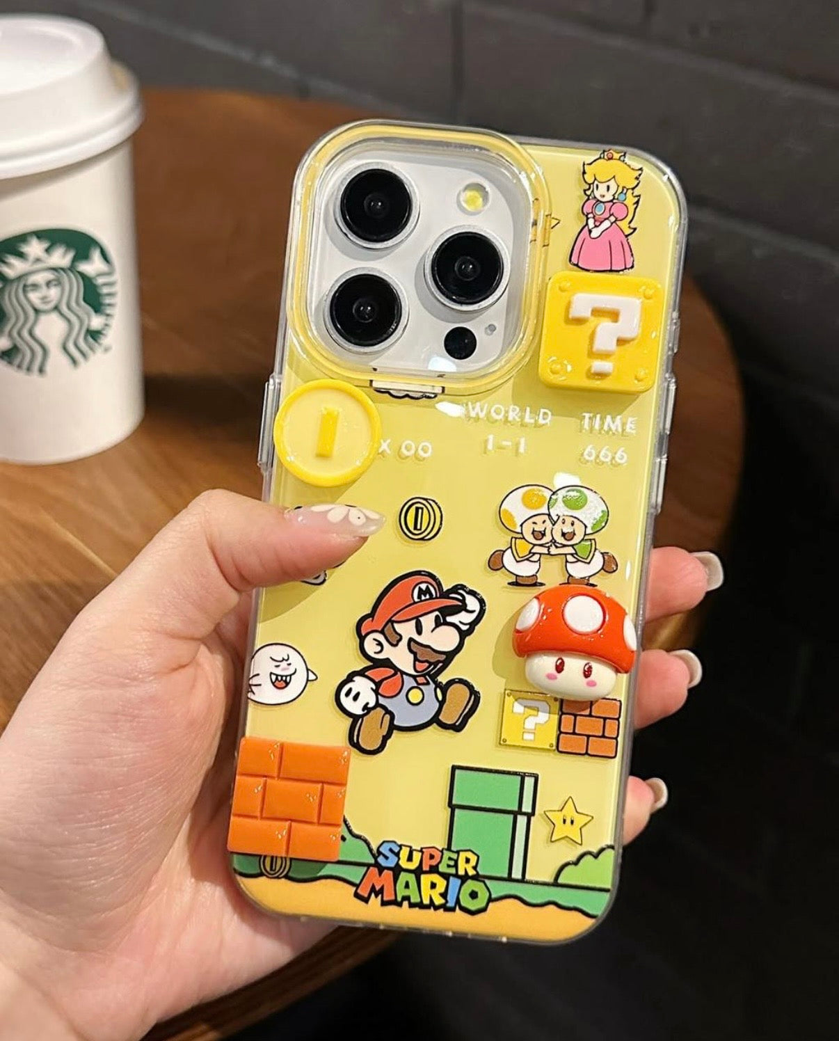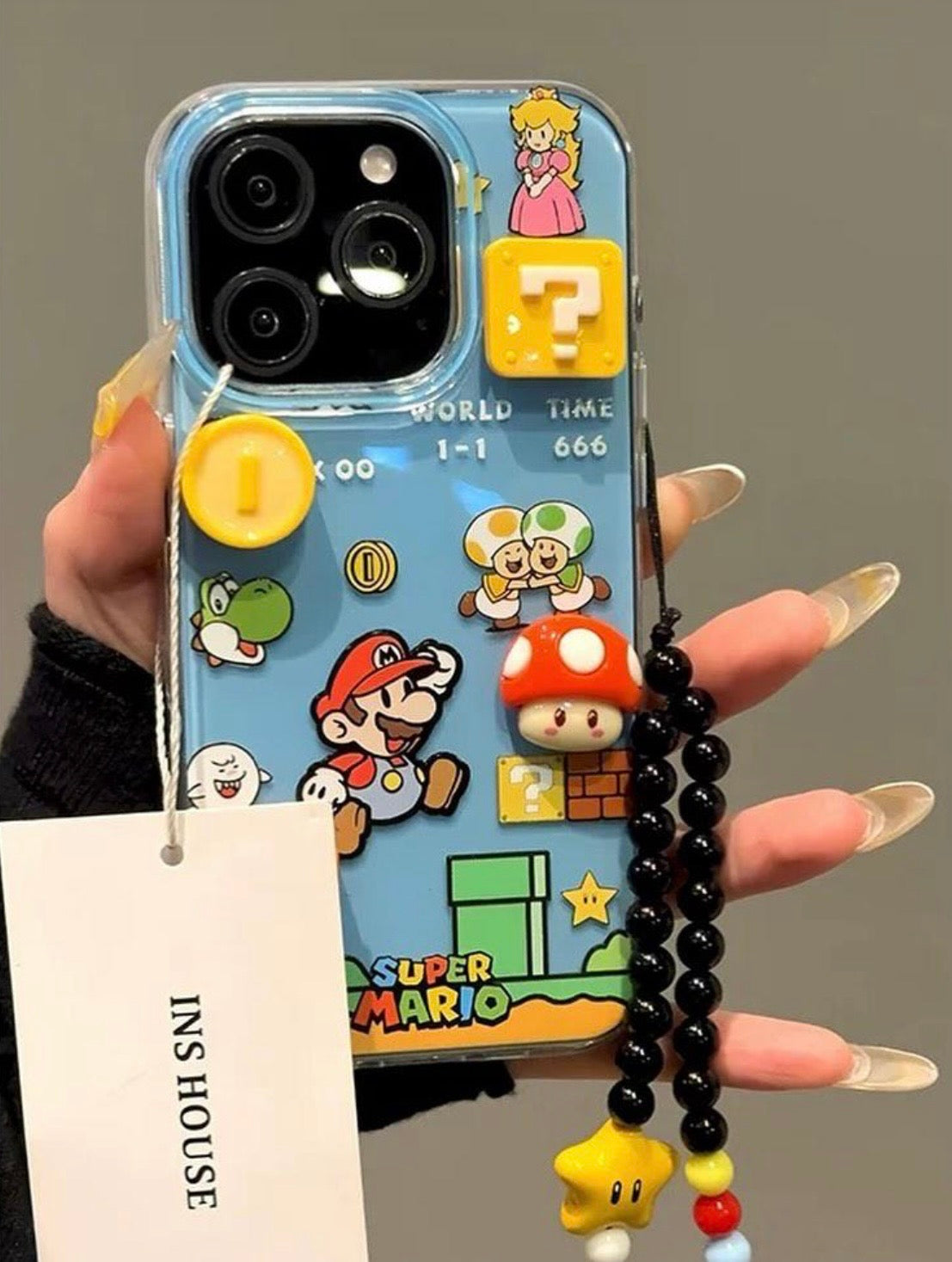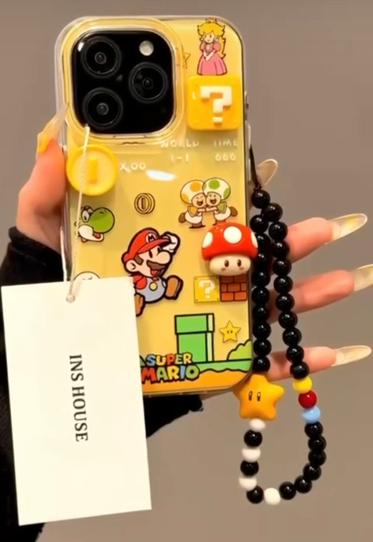 Level up your phone game with the Mario Case - iPhone  Bursting with nostalgia, this colorful design features iconic Mario characters, question blocks, coins, and a mushroom charm—plus a beaded strap for that extra touch of retro cool. Whether you're a gamer or just love quirky accessories, this case is a total power-up for your style.