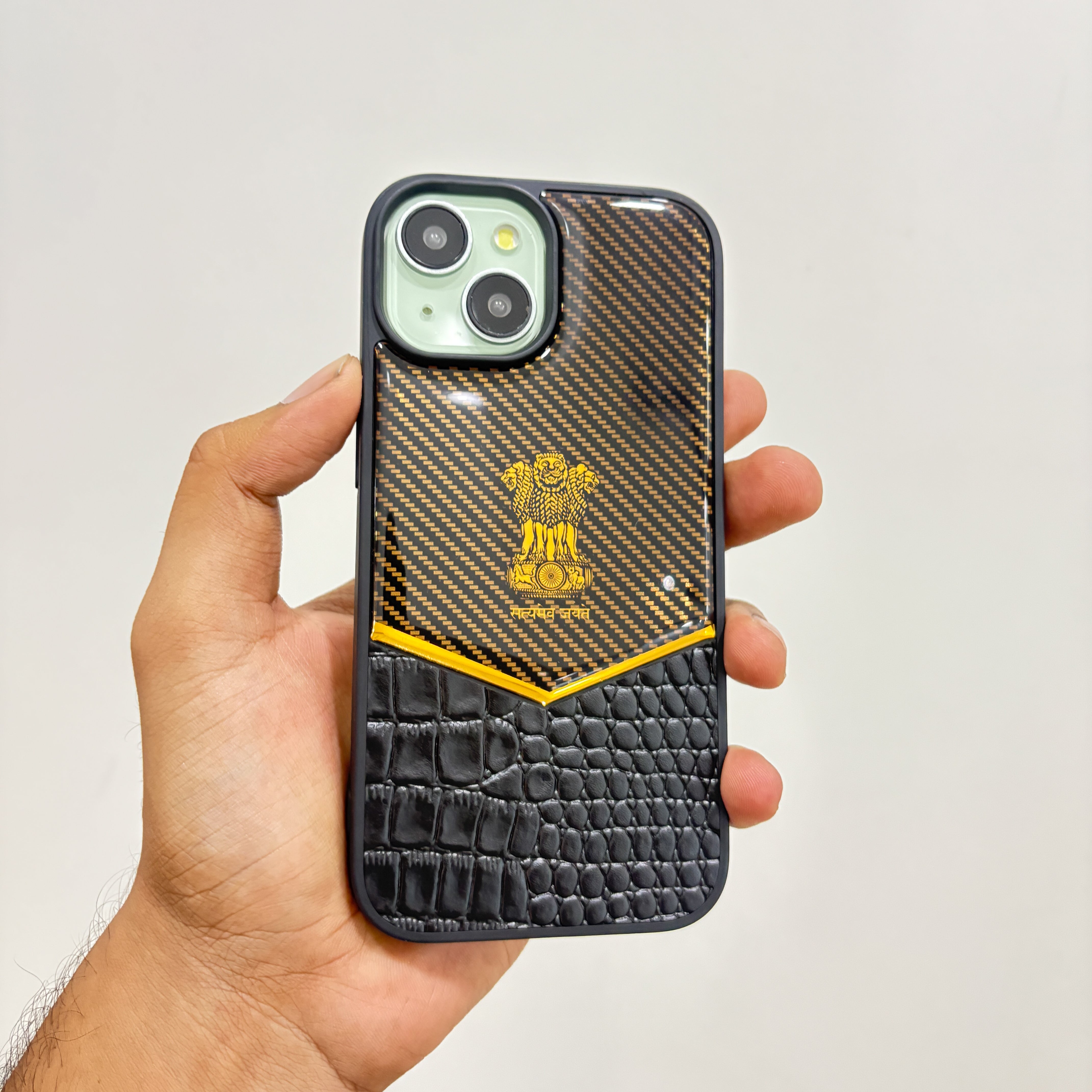 The Satyamev Jayate Elite Textured Case is designed for those who want to carry their patriotism with elegance. With a bold fusion of carbon fiber texture and premium leather finish, this case is more than just protection — it’s a symbol of strength, heritage, and modern luxury. At its center shines the Golden Ashoka Pillar Emblem with "सत्यमेव जयते", representing truth, honor, and the power of India.