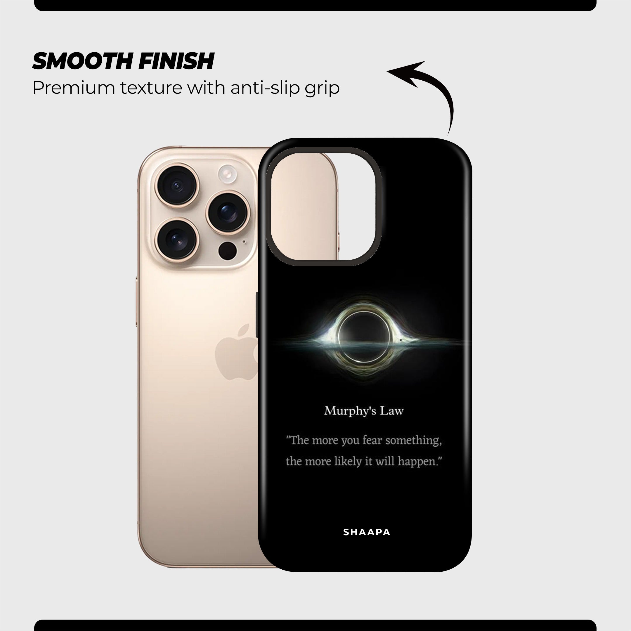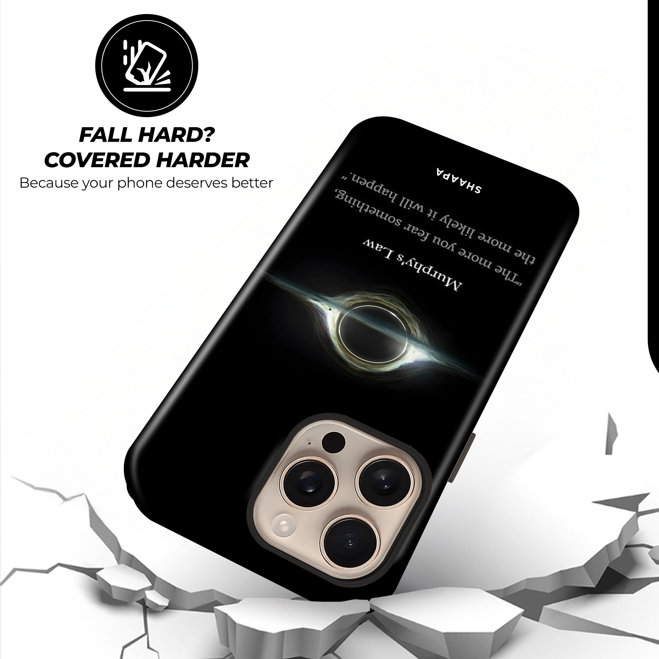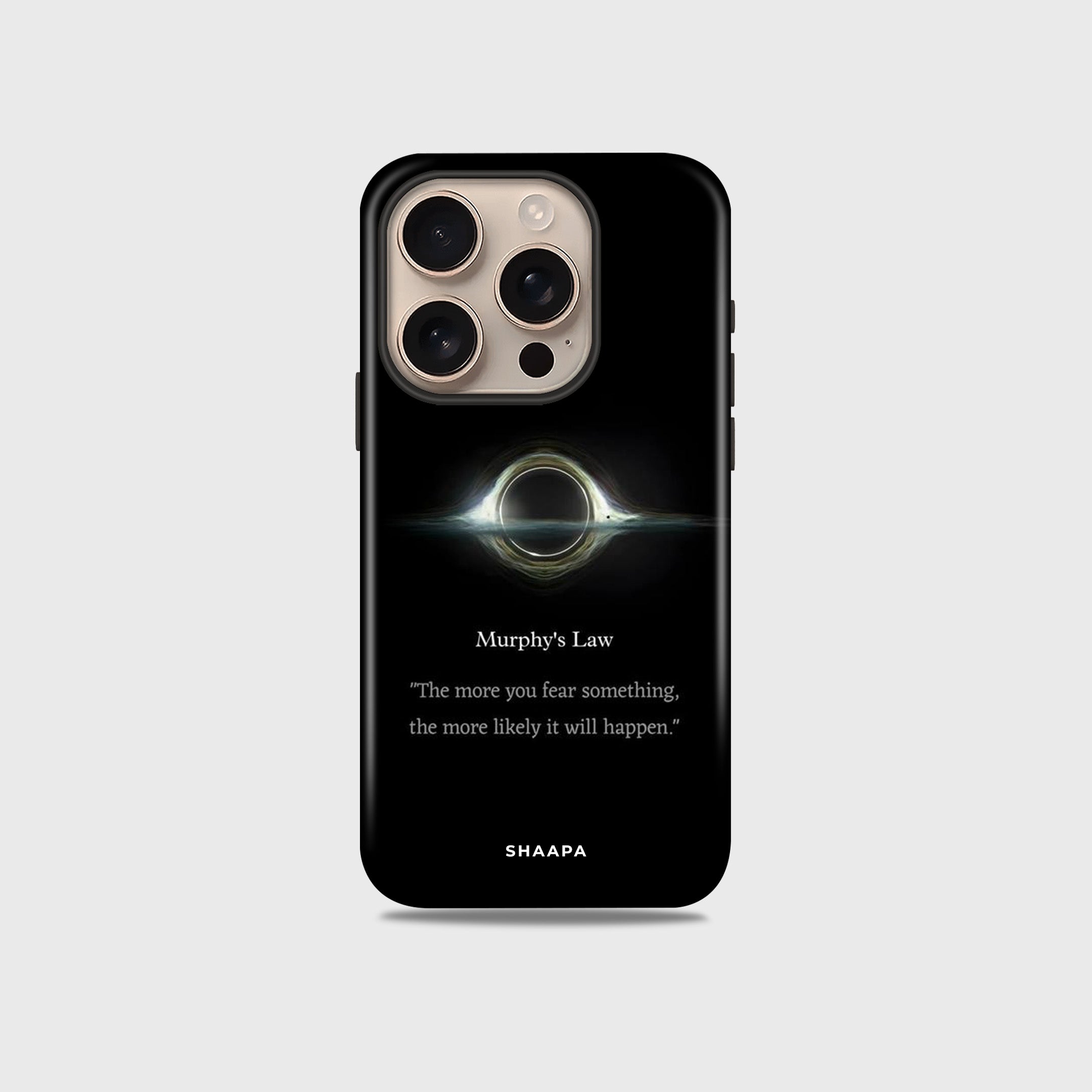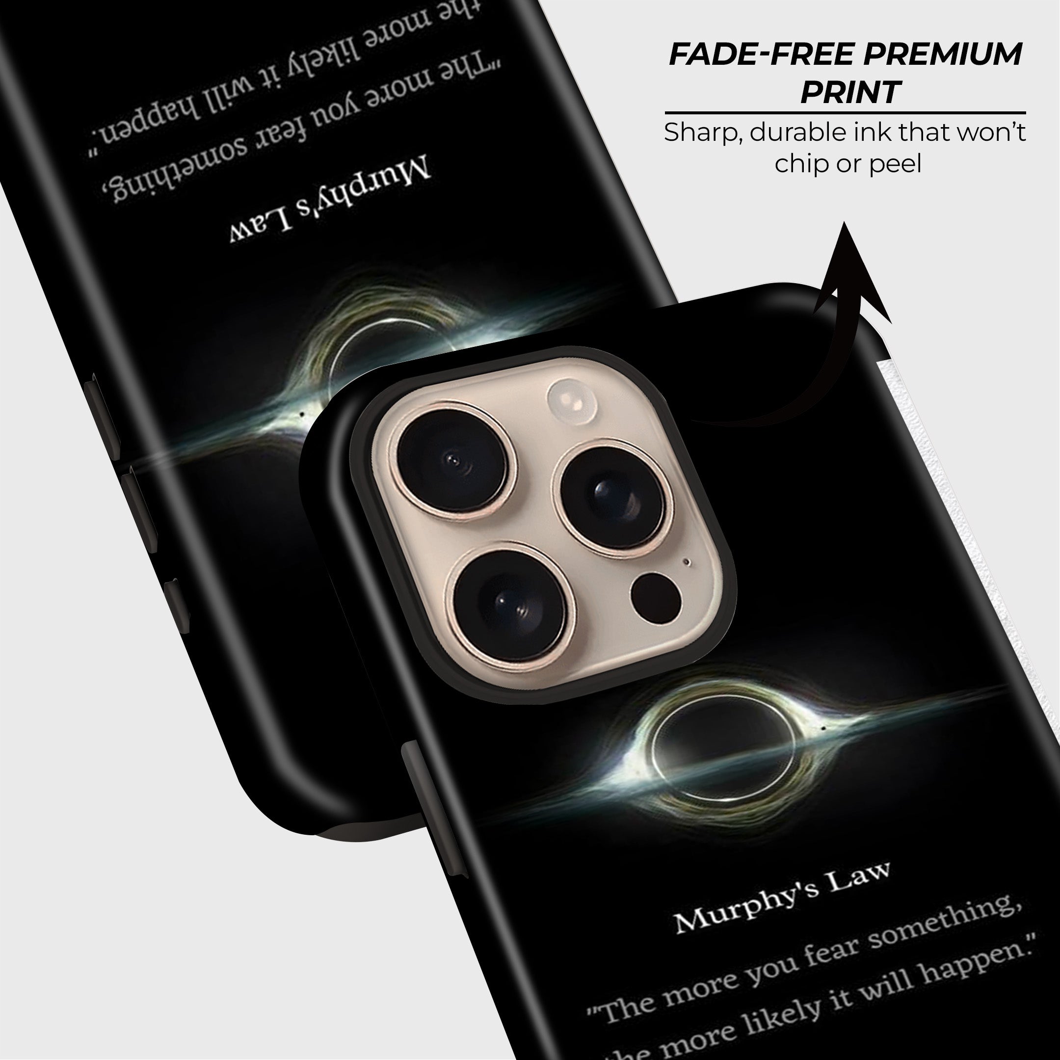 A cosmic-inspired black case featuring a glowing black hole with the text: “Murphy’s Law – The more you fear something, the more likely it will happen.” A deep and thought-provoking design for space enthusiasts.