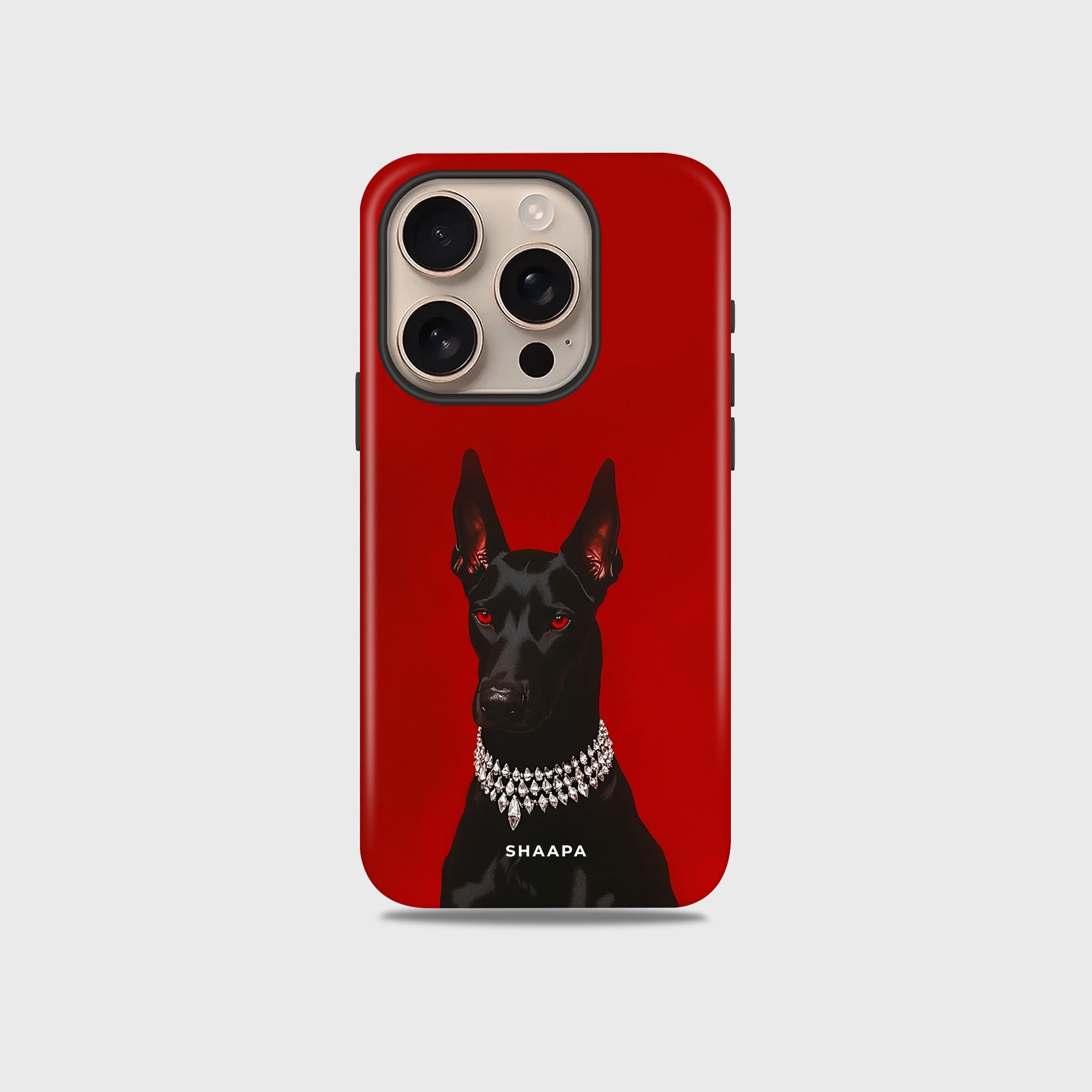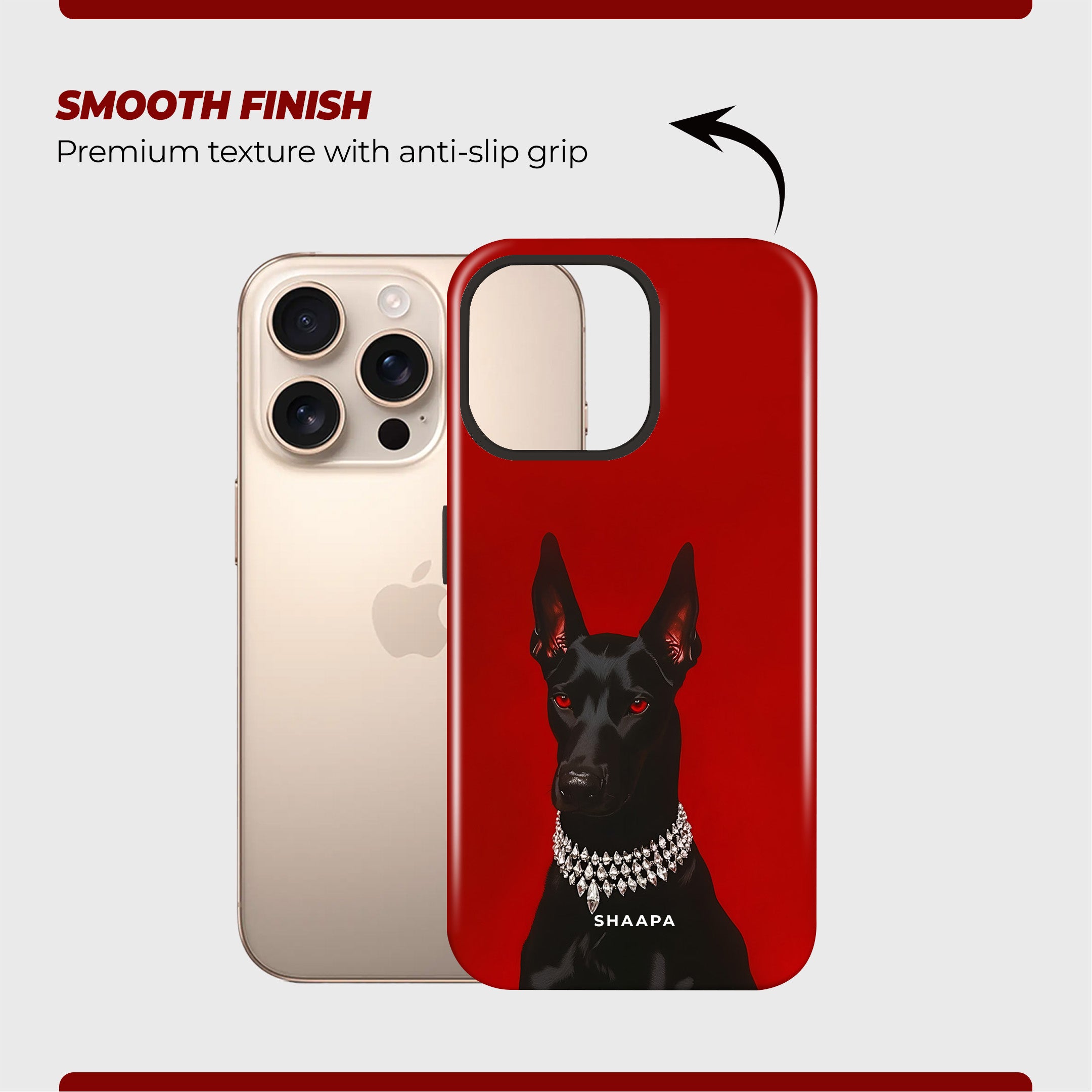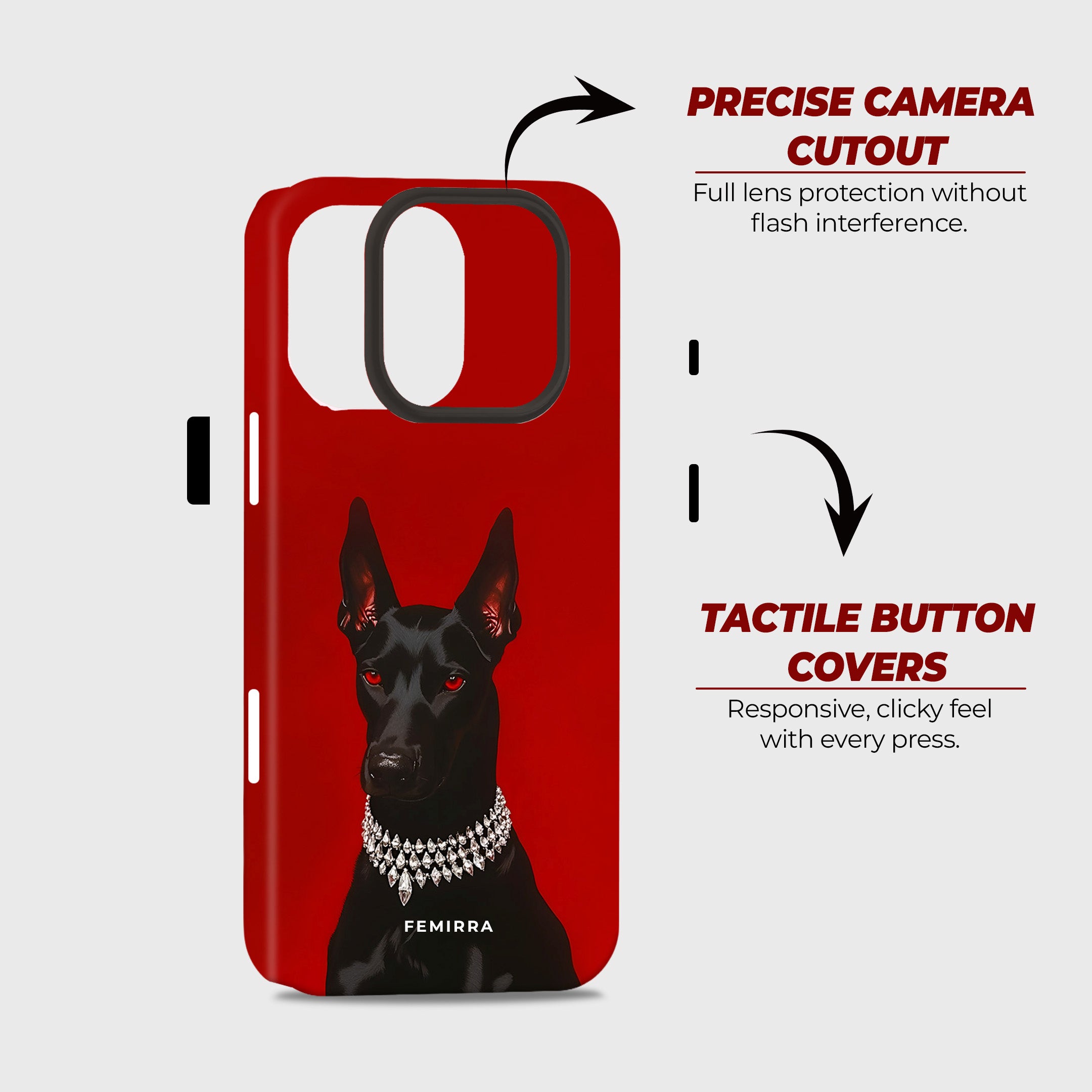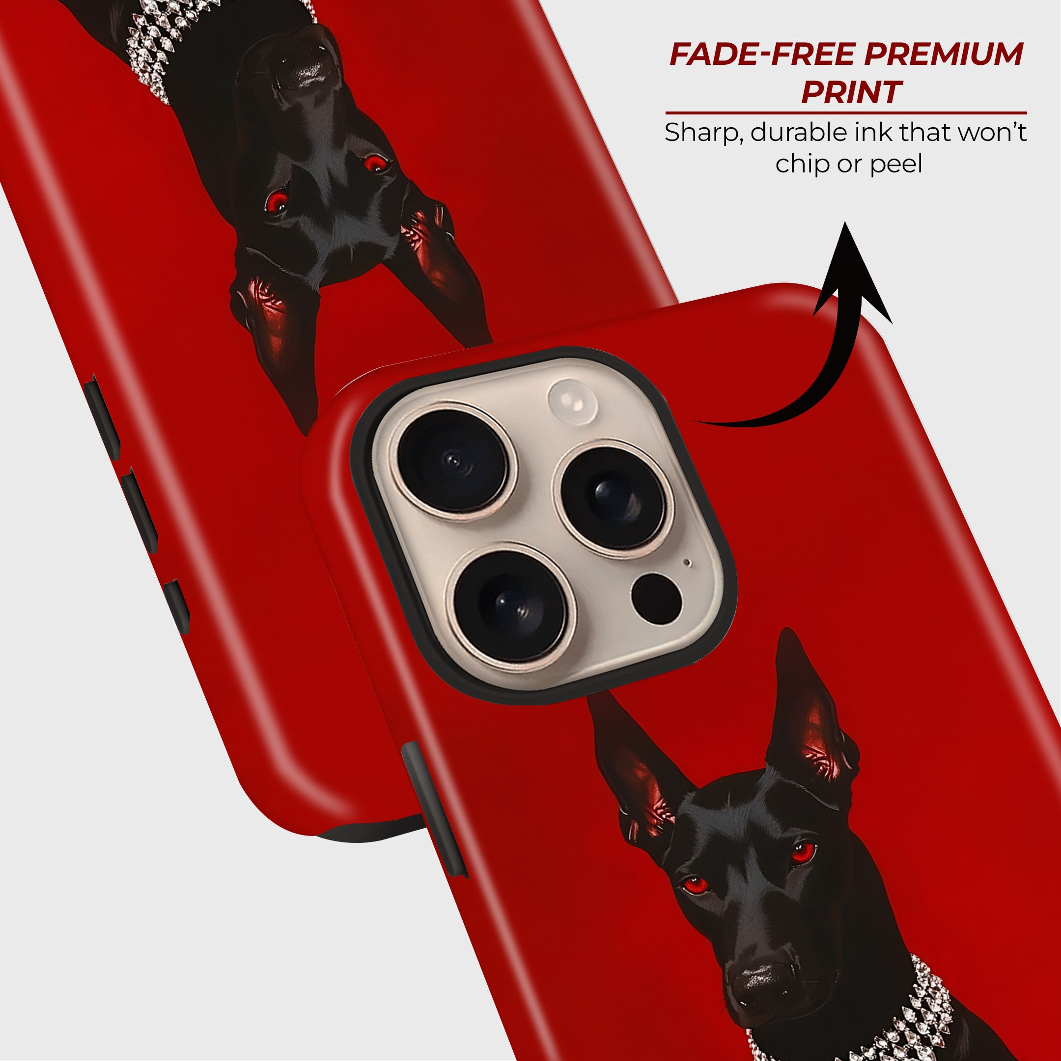 Turn heads with this Hellion phone case featuring a sleek black Doberman illustration set against a vibrant red background. The majestic canine is adorned with an opulent diamond-inspired necklace, radiating confidence, strength, and elegance