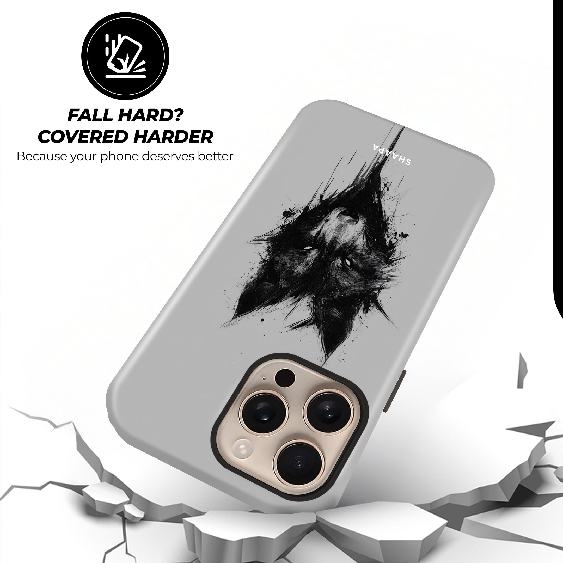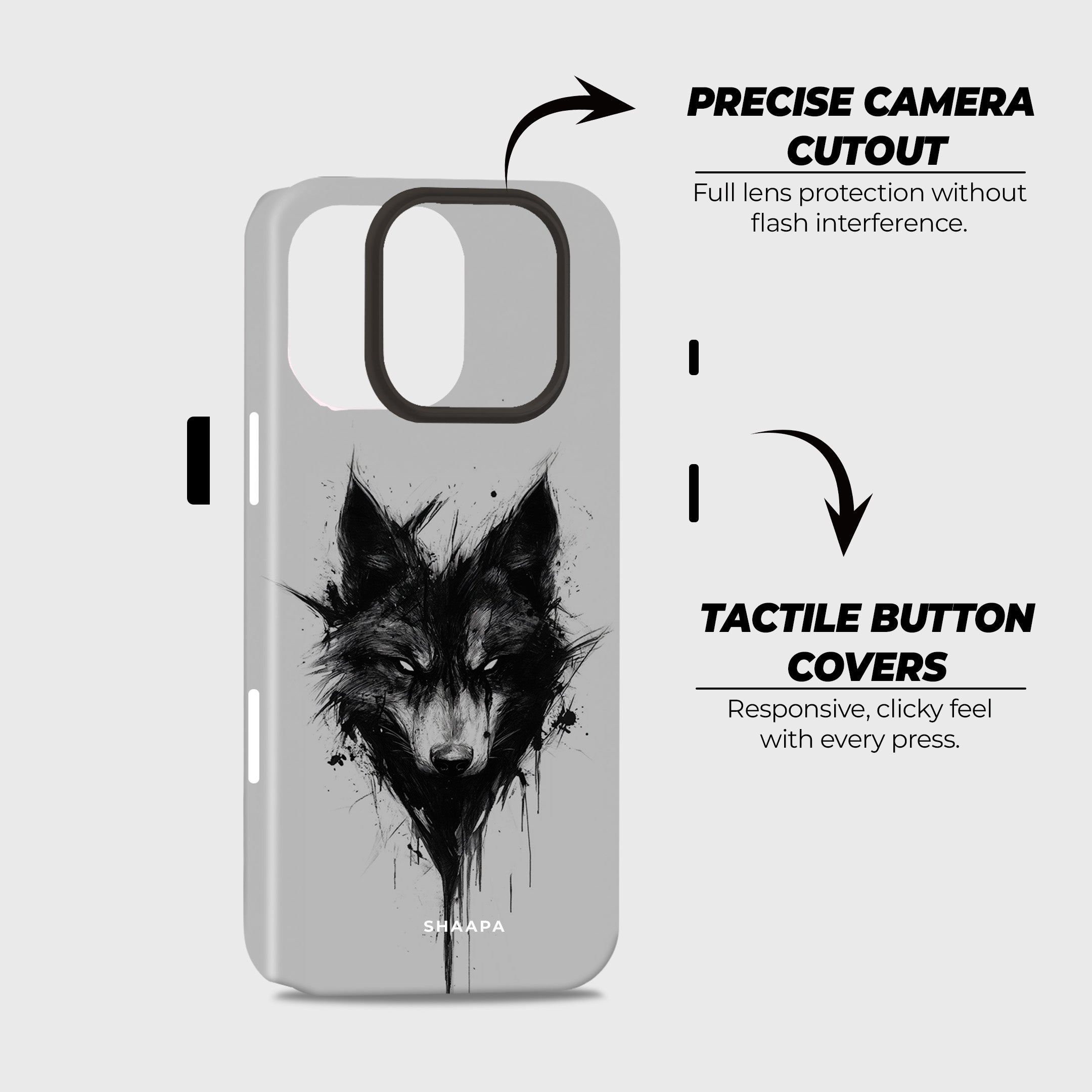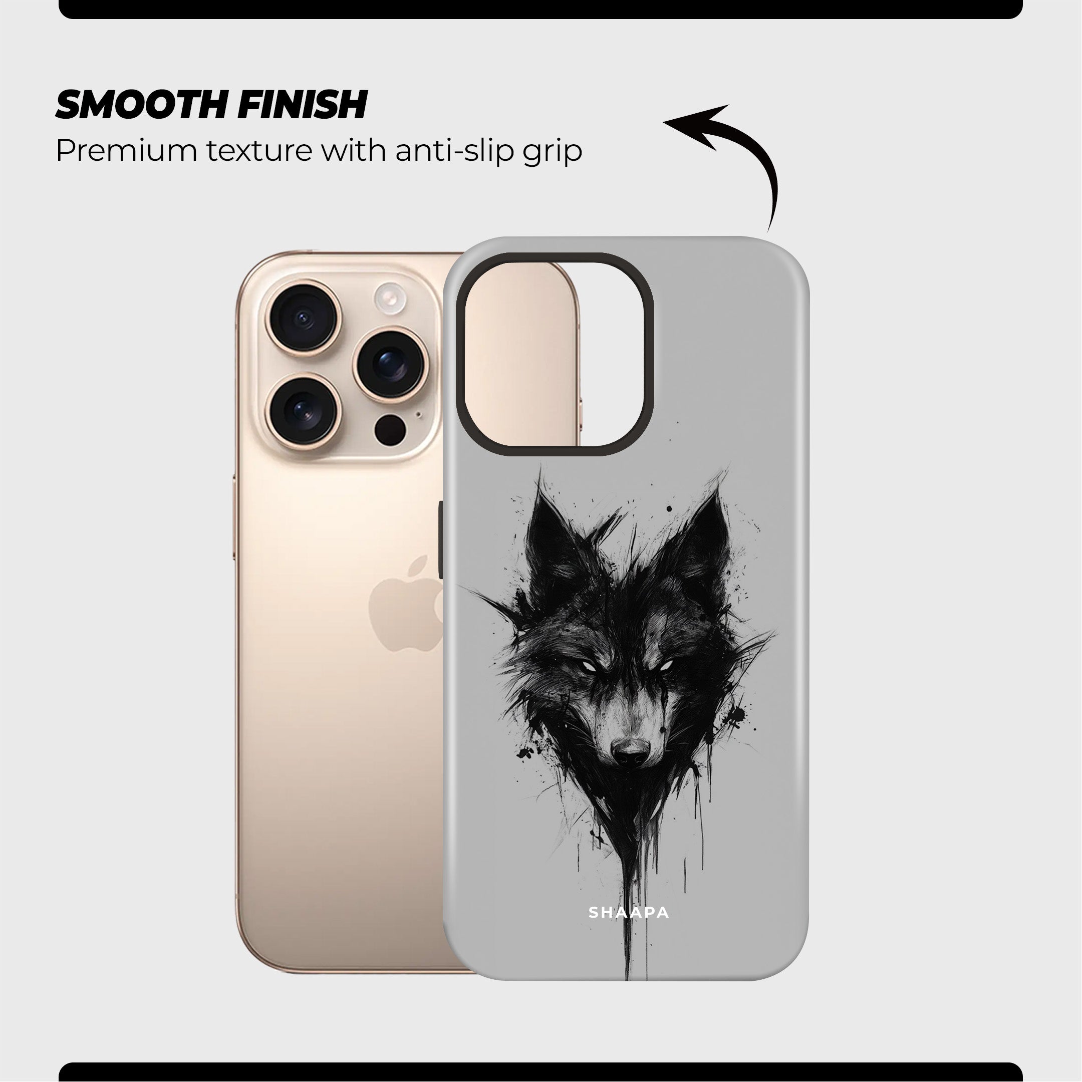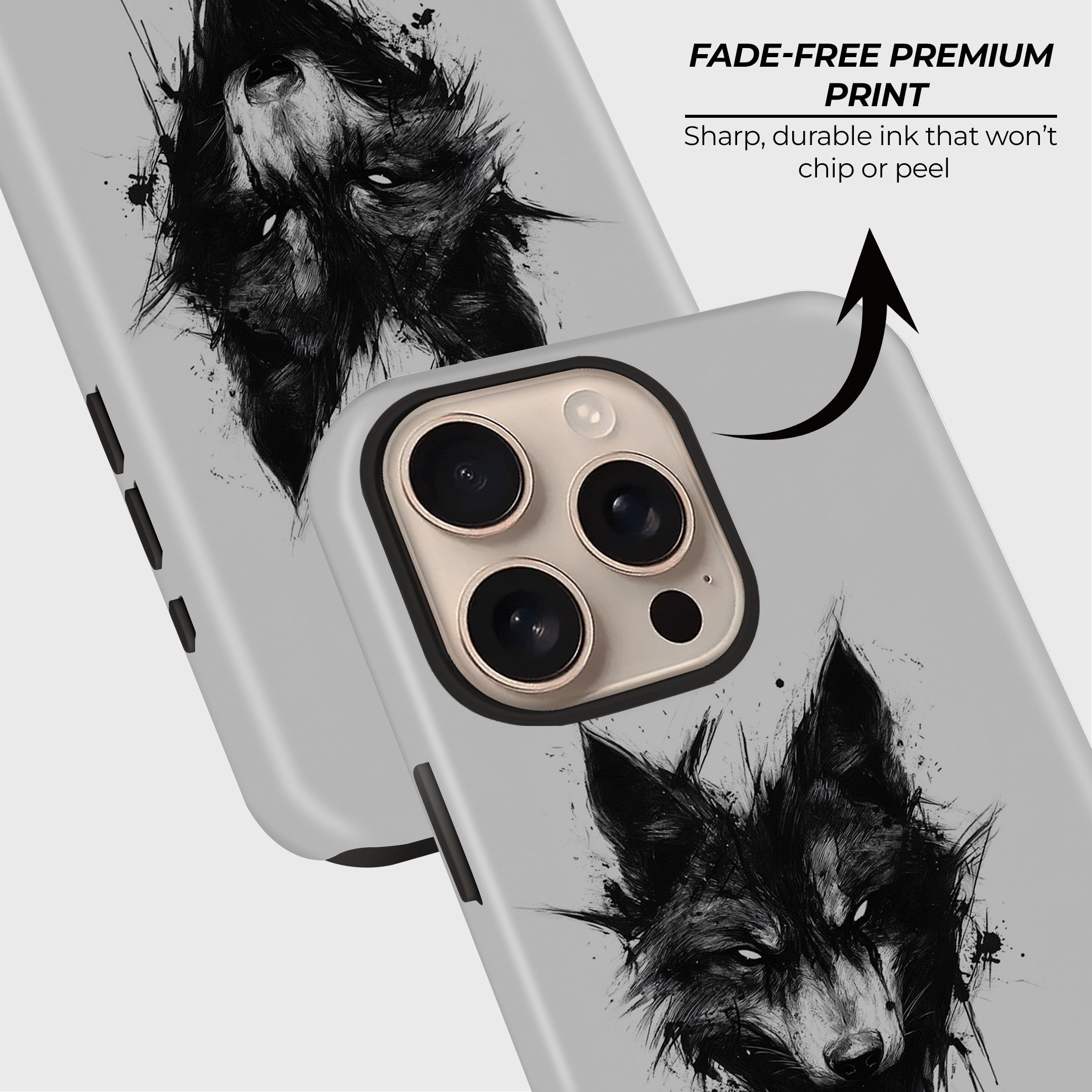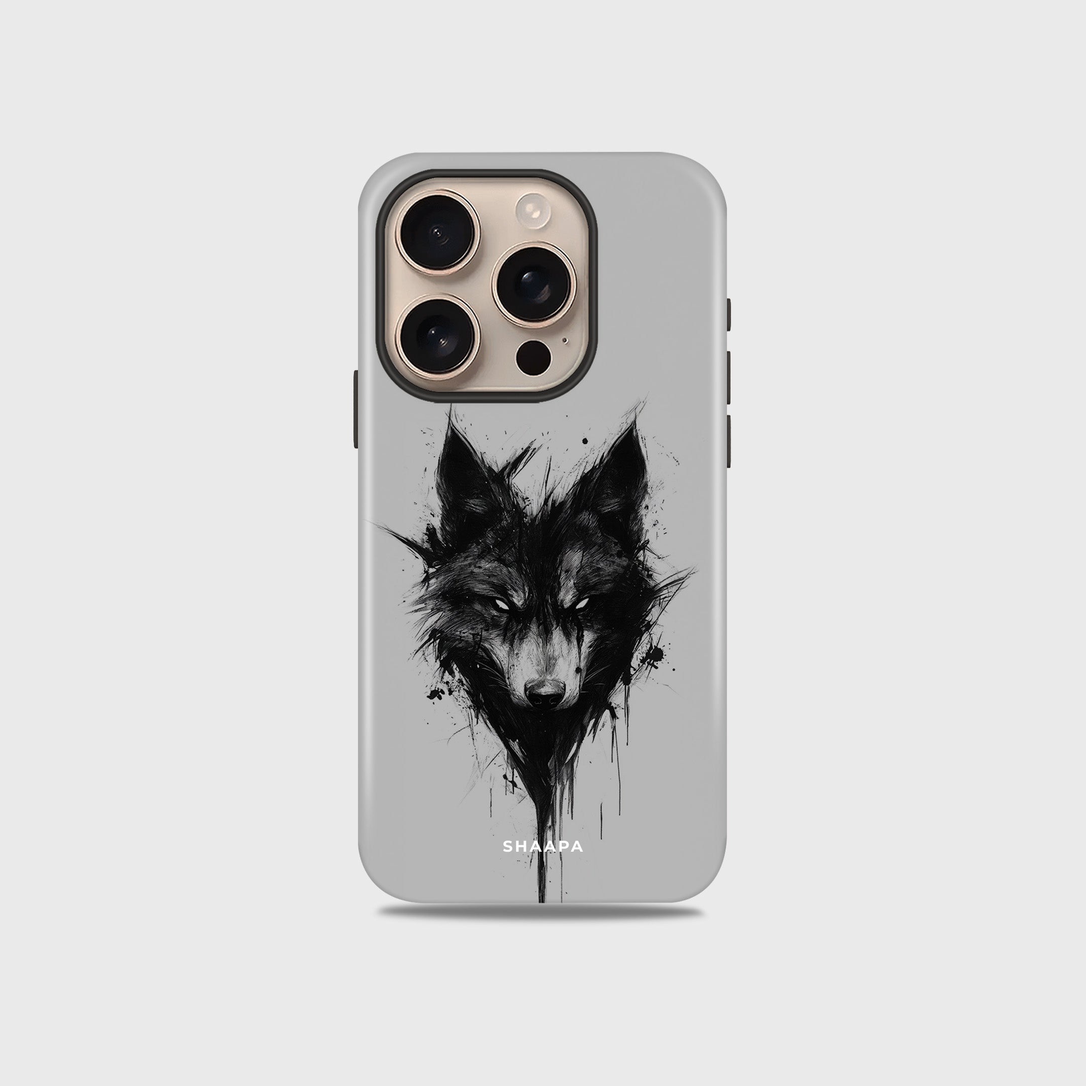 A minimalistic grey case featuring a striking artistic wolf design in black ink. The dripping paint effect adds an edgy and mysterious touch, symbolizing strength and wilderness.