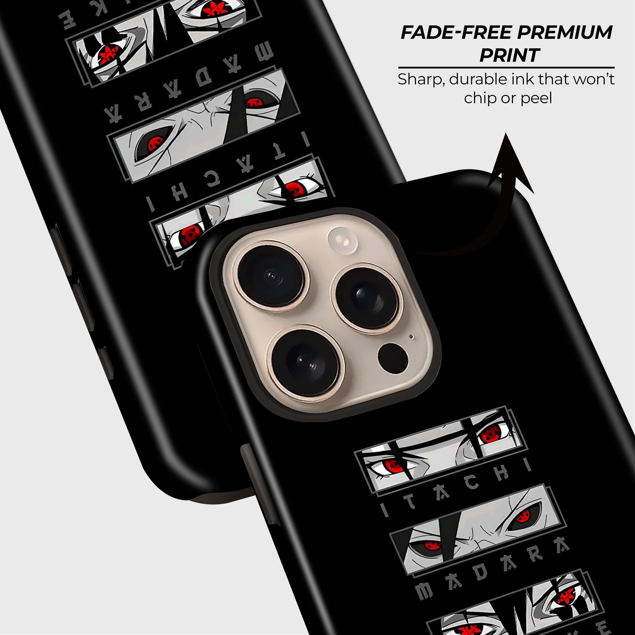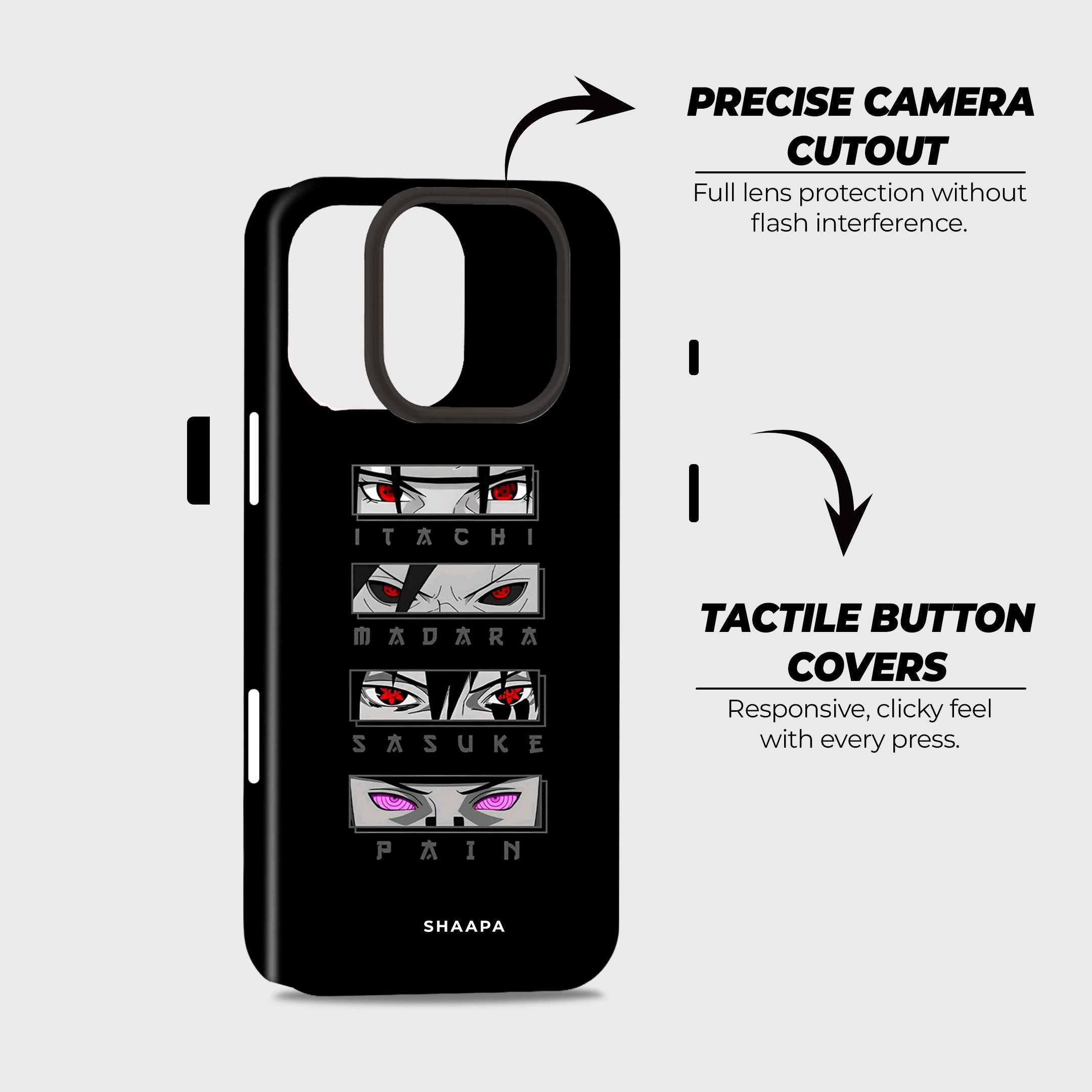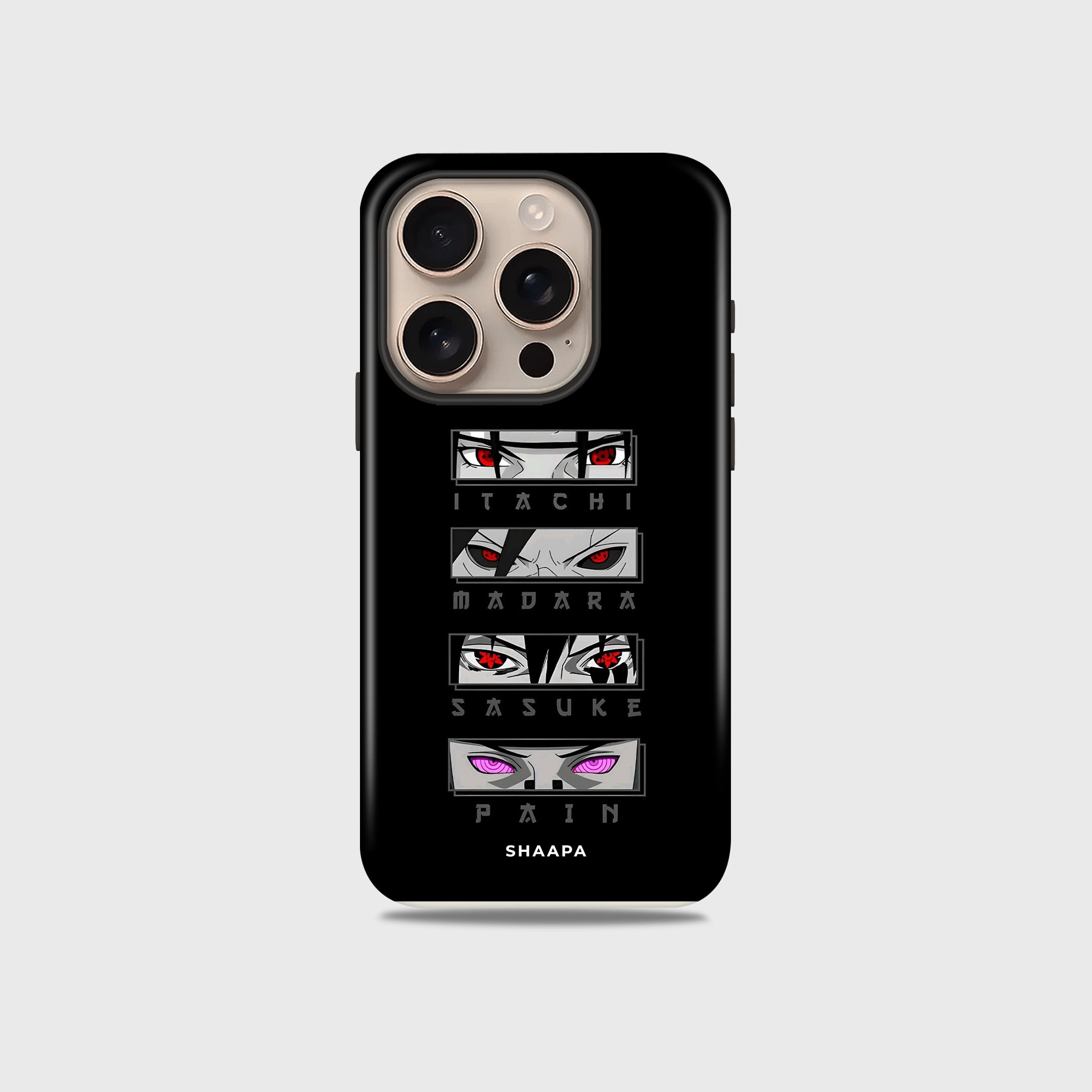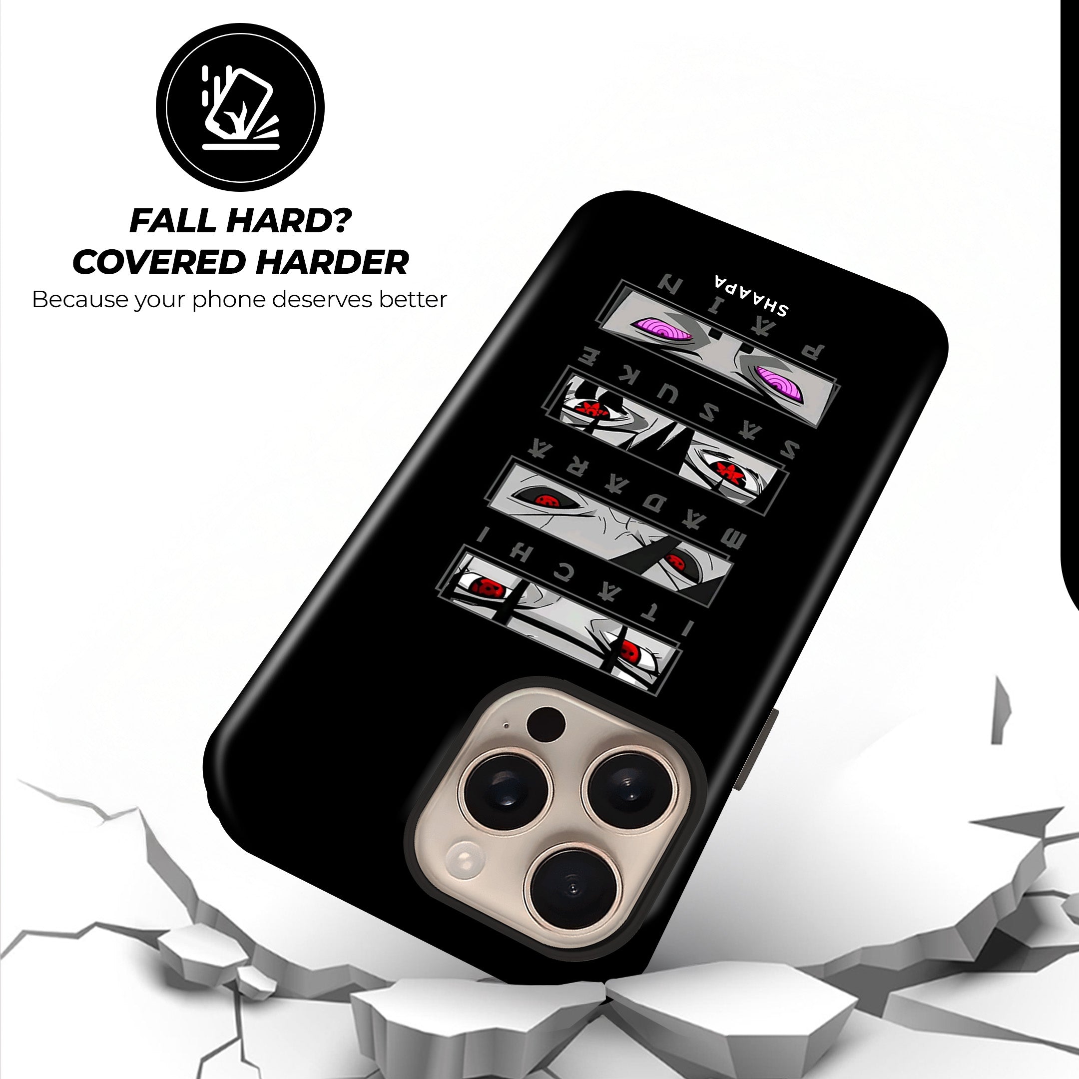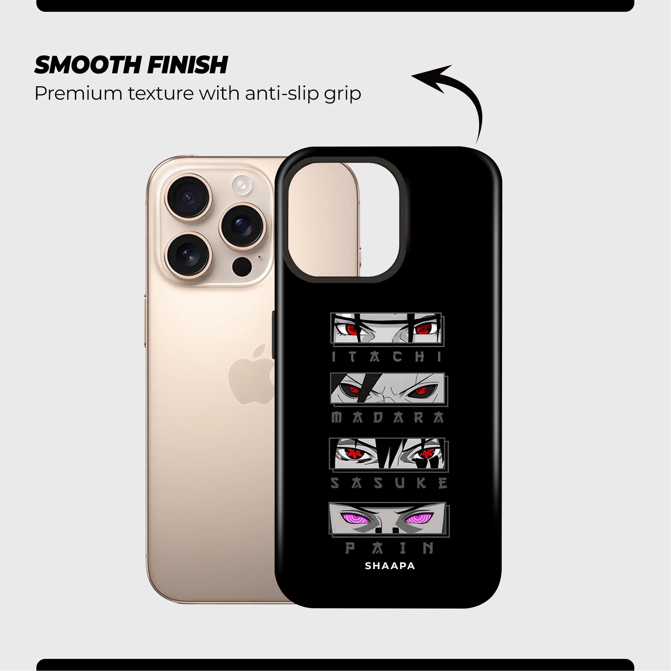 Inspired by iconic anime, this case showcases the legendary eyes of Itachi, Madara, Sasuke, and Pain. With bold red and purple accents on a sleek black background, it’s a must-have for true anime fans who admire power, mystery, and legacy.