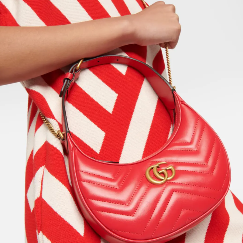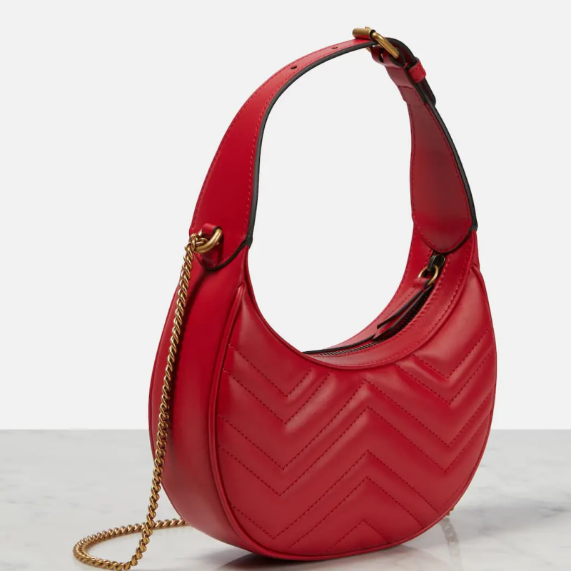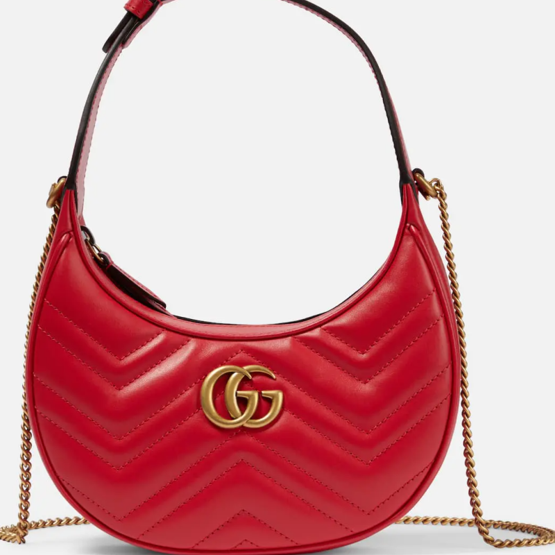 Meet the latest addition to Gucci's roster of It-bags: the GG Marmont Mini shoulder bag. The crescent-shaped style is made from chevron-quilted matelassé leather with an added curb-chain crossbody strap for versatile carry.